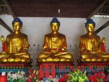 释迦殿内,释迦牟尼正中高坐,左右胁侍文殊、普贤,是本殿主要塑像。殿内四壁运用圆雕、深、浅浮雕手法,采取分层组合、连环壁塑形式,表现了佛教创始人释迦牟尼从投胎