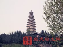 唐风明制 结构奇特 据寺内现存的碑刻记载,莺莺塔是明嘉靖四十三年重修的。91年5月在修葺莺莺塔时,从刹穴(天宫)内出的铜佛像和捐献记载印证,此塔确系明代嘉靖年间重修的。 莺莺塔平面呈四方形,底层边长8.35米,南向辟门,内为方室,室内后壁有一佛龛。第一层塔室不设楼梯,室顶砌作叠涩八角穹隆,中有一孔可通上层。第一层以上塔身内部皆为方形空筒。塔上壁用砖叠涩出檐13层,塔身高40米。二至九层,塔壁内设有转角通道,设台阶,可攀登盘旋而上。二层以上各层四面辟门,但真假相间,门顶作拱形,真门可供游人眺望。据古建筑专家罗哲文先生考证,该塔四方形空洞式结构,保留了唐塔的一些特点和风格,但它确系明代重修的一座密檐式砖塔。