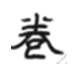 ”;演变为楷书“卷”。人们习惯把长条的字画,装裱以后,以画轴为轴把长条形字画卷成圆筒状收藏起来,观看时再打开;古代纸没发明出来以前,人们把文字刻写在竹简上,用绳子串联起来,不用时把串联起来的竹简卷成筒状存放,使用时再展开;“卷”引申为“书画,书籍的册本或篇章,印有考试题目的纸张,卷成圆筒形状的东西,圆场形状物体的数量”等义。读quán(全):字义:诚恳、柔弱的样子。