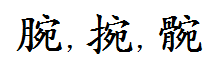 ”;组合起来表示:肢体上能随意、善于弯曲的关节。不仅有手腕、还有脚腕等。演变为楷书“腕、捥、䯛”,“䯛”用“骨”代替了“月”,强调是骨关节;后“腕”兴“捥、䯛”废。