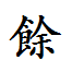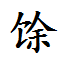 馀 (餘) yú 见“余”②馀⑤。 姓。 笔画数:10; 部首:饣; 笔顺编号:3553411234